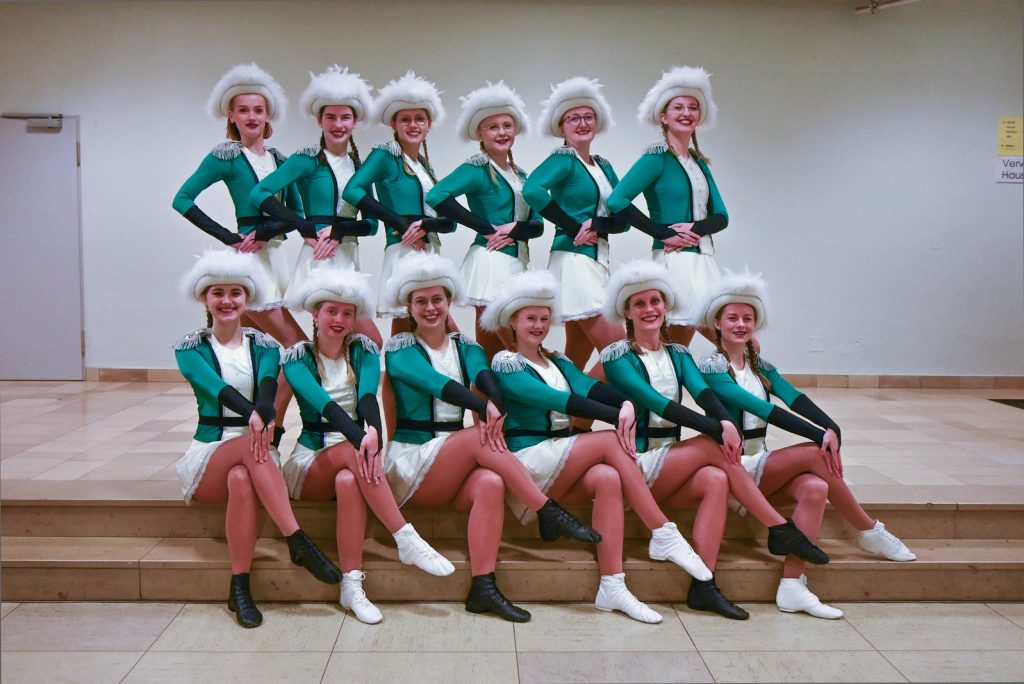 Unsere Funkengarde o.v.l. Henrieke Prues, Greta Ruhe, Carla Tepe, Jette Bührmann, Theresa Hammersen, Sarah Nuxoll; u.v.l. Tia Haupt, Franca Scheper, Johanna Nuxoll, Romy Drees, Sarra Zahner, Maja Stromann (es fehlen Nienke Krämer und Jasmin Schumacher)